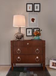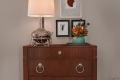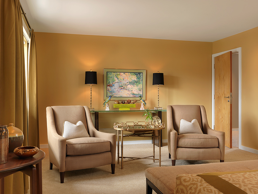 The nature theme continues in the suite’s sitting area, where a watercolor river scene hangs above a glass-topped console table, arrayed with ceramic birds, lime green pottery and buffet lamps with satin brass bases resembling bamboo. Clean-contoured club chairs and a bamboo-influenced accent table with mirrored top complete this inviting space.