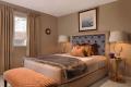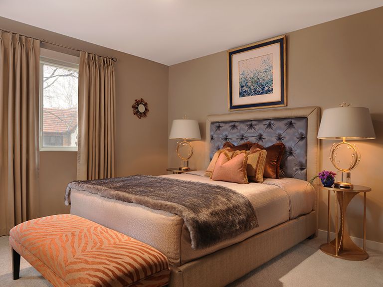 In the secondary bedroom, the color scheme transitions to serene taupes and grays, with tinges of blue. The shimmering blue-gray headboard is bordered in taupe; the bed cover has a silvery sheen; and a faux fur throw, zebra-stripe cut velvet bench and reptile-textured upholstery on the bed base are subtle reminders of nature’s wildlife. Among the designer’s special finds, the decorative lamp bases, trimmed in gold with crystal-tipped floral sprigs, are a perfect match to the gold-painted, sculptural bedside tables.