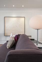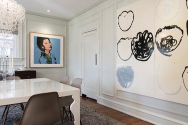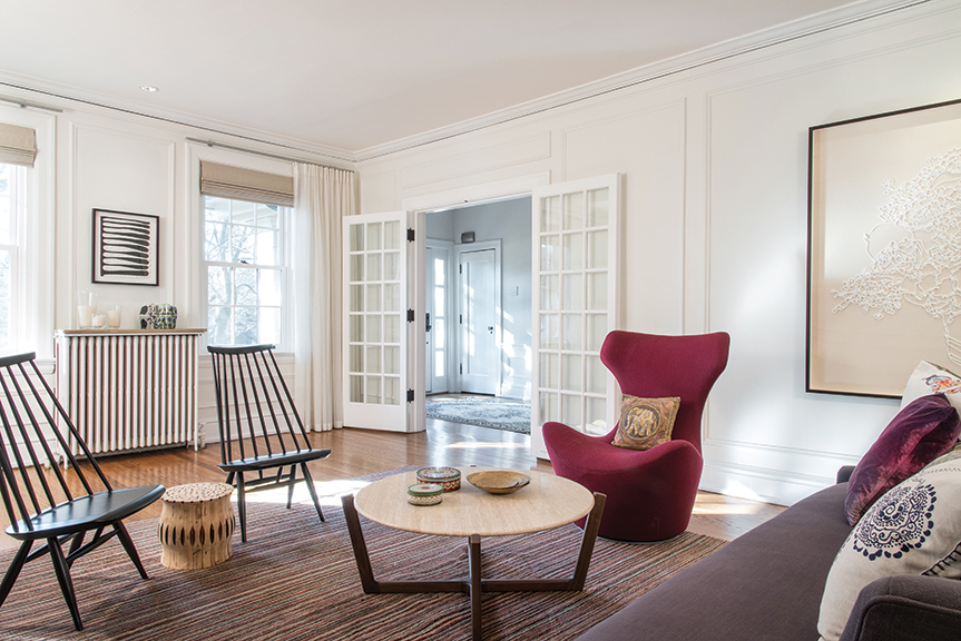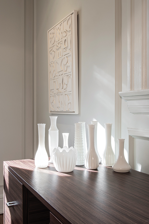 Wrapped in white and other pale hues and detailed with original crown molding, the walls of the home act as the perfect neutral backdrop for the artistic assortment of artwork and chic trimmings that adorn each room. “I like to call accessories ‘jewelry for the room’ because a fun pillow or piece of artwork can pull a space together much like a necklace or scarf can pull an outfit together,” she says.