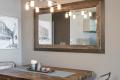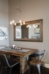 Dorian also needed a place to sit and eat, so a dining space was created in the living area. “I wanted a table large enough to be able to entertain,” says Dorian. The rustic wood table can be pulled out if needed and includes a mix of metal and leather chairs and a bench. To fill the blank space on the wall Candice found a large mirror, which keeps the space feeling open while also pulling in the design elements of the table and chairs.