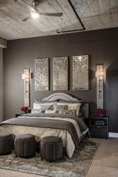 While the rest of the loft has a more rustic, transitional look, the master bedroom is all about the glam. “It was fun to get to work with a single, female homeowner because it allowed me to be able to play up the feminine elements,” Candice says. Calling it Dorian’s private sanctuary, the master bedroom mixes drama, texture and sparkle.