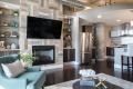 A tile choice set the color scheme for the main living areas. The fireplace, which Dorian loves, was simply a blank, beige wall. Candice envisioned the fireplace as the focal point of the room, so she knew she needed something to guide your eye toward it. She found a great tile with a wood finish and hints of blue. She carried the serene shade throughout the open, airy space.