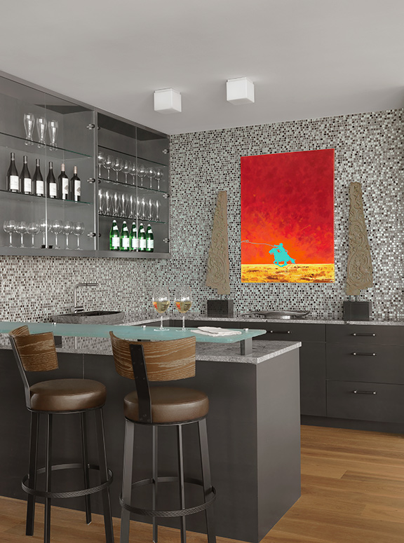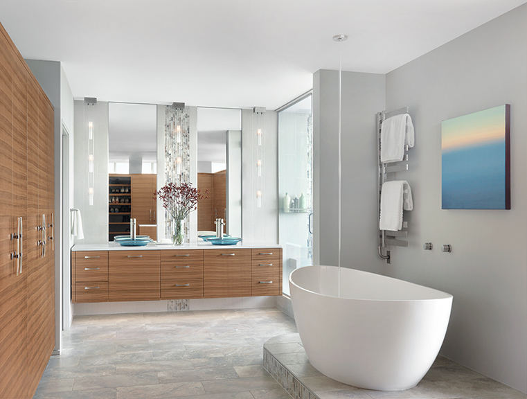 To further offset the architecture’s strong verticals and horizontals, Castle used a variety of furnishings with curvilinear shapes. A few random examples include molded chairs surrounding the kitchen island, curved chair backs in the breakfast area and upstairs bar, the master bath’s ovoid soaking tub and, in the great room, a circular Baker coffee table, tripartite circular leather ottoman from the owners’ previous home, and softly cushioned seating.