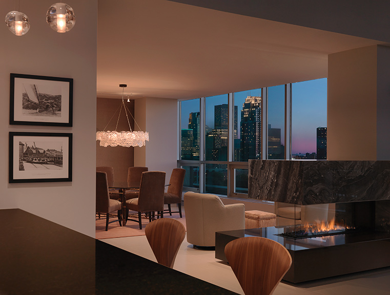 The penthouse’s awe-inspiring landscape views provided inspiration for Castle’s interior design, which emphasizes organic elements – reclaimed native woods, marble and stone, various metals and a sophisticated color palette drawn from the rare Italian Arabescato Orobica marble chosen for the kitchen backsplash and dining-room fireplace façade.
