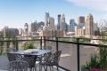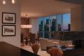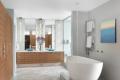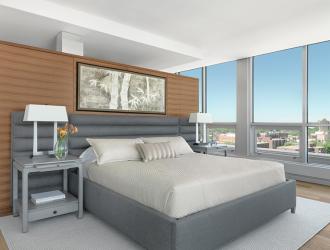Asian-inspired, the master suite is a peaceful haven, with the custom bed set against a freestanding, wood-plank wall that separates the bedroom from the wardrobes and sumptuous open bath, accented with pale blue glass wall tiles and vessel sinks. Although not much of an issue at this height, privacy is afforded by motorized window shades throughout the penthouse, providing solar protection and preserving the extraordinary views.