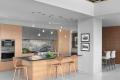 Encased in Arabescato Orobica marble, the three-sided peninsula fireplace is visible from both the kitchen/breakfast area and the dining room, where the couple’s pre-owned dining ensemble is topped by a circular, multi-layered John Pomp chandelier. Custom-designed to span the kitchen’s matching marble backsplash, a nine-foot matte-finished steel hood tops the six-burner Wolf range and two prep stations — all complemented by custom-glazed rift-cut white oak cabinetry and charcoal granite countertops.