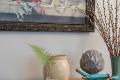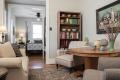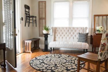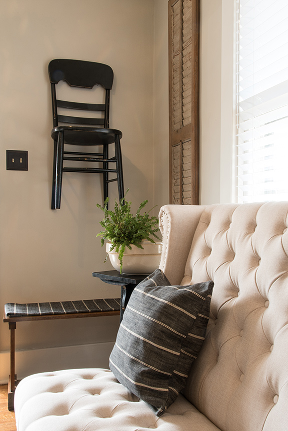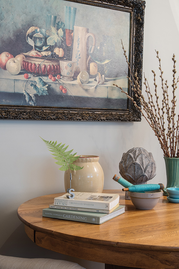 “The entry was used as perhaps a sitting room when the house was originally built in the 1916, but evolved into a dining room.” Now, the entryway serves both purposes. A round oak table occupies the entry, with a pair of chairs shifting from the foyer to elsewhere depending on how the space is being used. “One chair is hung on a wall in the bathroom as art when not in use. The other goes to the desk.”