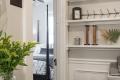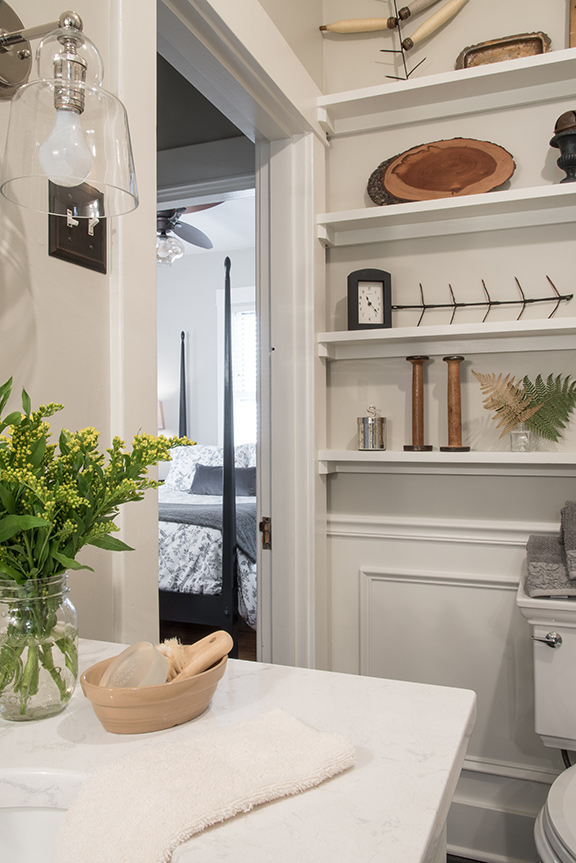 Only two closets graced the home–one in the bedroom and one in the hall–so Krista had to get creative about addressing Stacy’s need for storage. “I found a cavity in a wall that was unclaimed for any use, so we grabbed it and made it a recess for a linen closet,” she says of the cramped bathroom. “We took out the tub to create a bigger shower and used part of that space for storage.” By building in five-inch shelves on the wall behind the toilet, she created a showcase for a collection of family antiques Stacy couldn’t properly show off before.