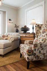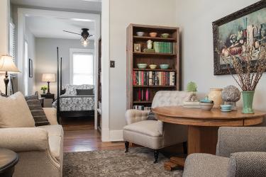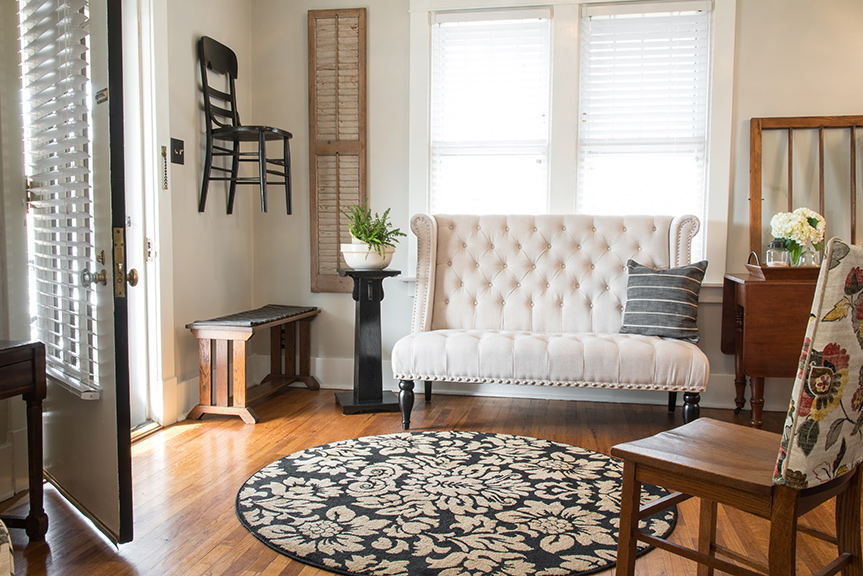 Krista used furniture to further amp up the illusion of space by scaling down the furnishings in proportion to the home. A cozy loveseat here, an upholstered living room chair there, all offering a soft place to land for guests without eating up the floorspace.