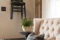Krista applied the same technique to the kitchen area, which Stacy envisioned as a great spot for small gatherings. “She wanted the breakfast room to be a ladies’ wine room, so we wanted kind of unconventional furniture off the kitchen so she could sit on a chaise lounge and sip wine or have friends over,” Krista says.