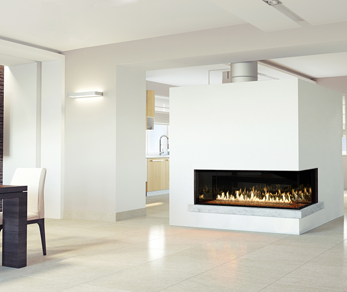 Some European manufacturers do offer wood-burning units, “but most are gas,” Copeland explains, “and there are two options with those: ventless and direct vent.” Vent-free or ventless is just as it sounds, according to Copeland. “An open box and no flume. They aren’t nearly as popular as the direct vent, which I think is a better system.”