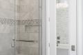 No more pre-turn-of-the-century green, either. “The color palette is very neutral with layers of different shades of whites to grays in many different textures to create interest,” says Mascetti. Stacked white marble tiles behind the new freestanding tub and white marble subway tiles behind the vanity — with similar larger tiles in the shower — perfectly complement the adjacent light-gray walls. A Jeffrey Court accent border in gray and white pulls everything together.