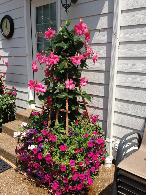 “Mandevilla vine is widely used for its showy pink flowers. They thrive in warm, humid weather  (perfect for St. Louis) and bloom continuously from late spring to frost. They are not cold-hardy in the Midwest but easy to replant annually and look outstanding in containers. Use them to cover arbors, trellises and fences.” Richard Poynter, https://www.poynterlandscape.comhttps://www.poynterlandscape.comhttps://www.poynterlandscape.com