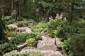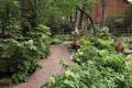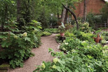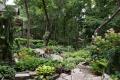 Fine gravel pathways, lined with multi-toned hostas, loop and crisscross down a steep, tree-covered hillside making the slightly over two-third-acre space seem refreshingly endless. Planting areas created with natural stone anchor the garden's elevations and flagstone steps provide access from one level to another.