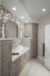 Alspaugh Kitchen and Bath began this bathroom renovation with a simple equestrian for a “just-for-her” space with plenty of storage. To achieve this goal, double sinks were removed in favor of a single sink. A small closet was replaced by a tall angled cabinet for storage of extra linens. Sharply angled walls presented a challenge. The designer’s solution was to remove an awkwardly placed door and a seldom-used tub. This created a more useable space with a larger shower. Custom cabinetry in a rift-cut oak provides a soft, neutral look. Mid-height cabinetry anchors the floating sink cabinet and drawers. The wall behind the sink features a stunning Arabesque pattern of glass and stone tile. Sleek sconces function as decorative accents that deliver even light across the face. Large-scale porcelain tile covers the bathroom floor. The same large tiles line the shower walls, wall-matching mosaic tiles adorn the shower floor. A mosaic stone listello outlines the shower’s angled shape around the shower floor. The spacious shower also includes a seat, a new window with enclosed blinds, a niche for shower products and a hand-held shower.