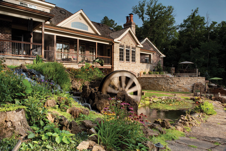 While the rocks and the water are dramatic, it is the careful addition of the plant life that truly ties the project to the land. Thirty-seven dogwoods line the over quarter-mile pathway that meanders from the top of the hillside through the landscape and down to the lake. Tiny, purple-flowered mazus peeks from between the broad stepping stones. Along the path ferns, ajuga and native hydrangeas accent the shady stretches, while native coneflowers, black-eyed susans, daisies and day lilies provide bold color where the sun hits the hillside. Creeping sedum stretches out over a number of boulders turning hard, gray projections into green glowing mounds. Bright annuals such as cannas, coleus, elephant ears and trailing sweet potato vine surround the water lily-filled ponds. The addition of evergreens, particularly blue spruce, help provide the Colorado ambience the homeowners craved and year-round interest. An 8-foot waterwheel adds to the rustic charm.