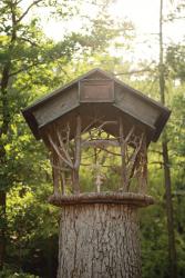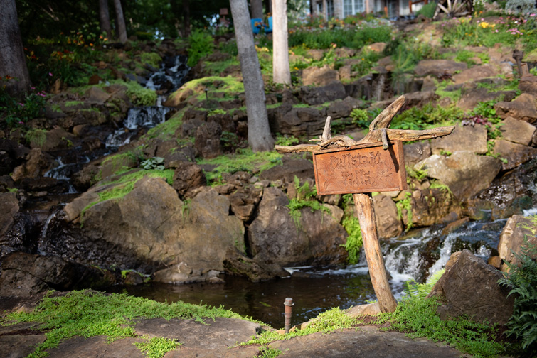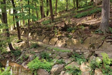It has been five years since the completion of the project and the landscape changes every year with the addition of new shrubs and perennials and the maturation of those already there, the homeowner says. Small details add charm to the rugged setting. Signs carved by Caleb from wood taken from the property note the special features of the landscape. There is even a fairy house with a living roof perched atop and old tree trunk. "The effect of seasons on this waterfall are amazing," the homeowner adds. While spring and summer would naturally be prime time, "my husband has taken photos in the fall and winter that are just beautiful. It is a very special place."