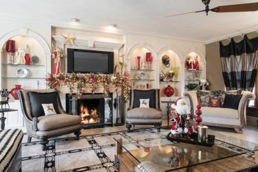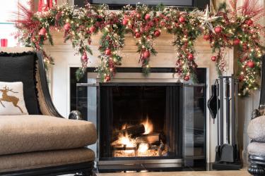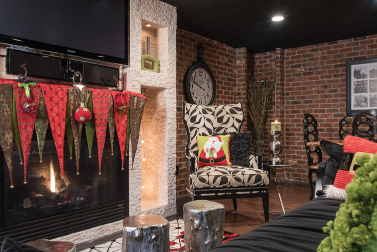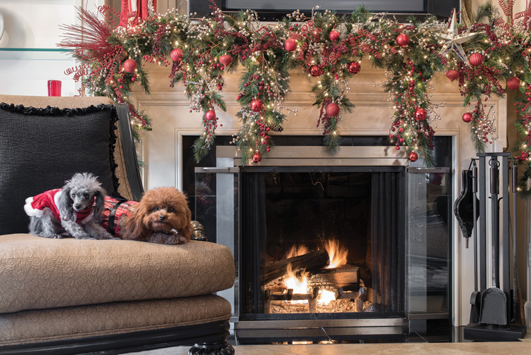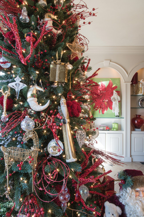 “I like ‘less is more’ in a lot of applications but with the fireplace, more is more. I almost overdo it; I put a lot of sparkle and a lot of lights to it,” says Pamela. The heavy-handedness simply works, particularly in the living room, where evergreen foliage festooned in red and gold ornaments, sprigs and lights cascades from the mantel.