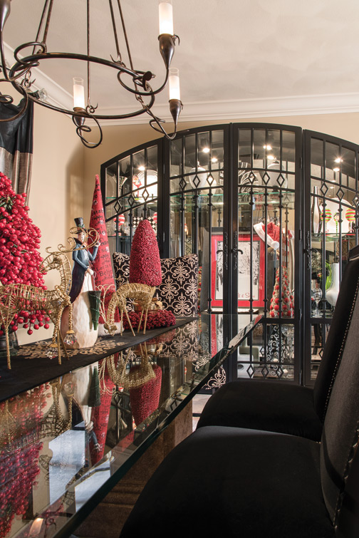 It seems a great deal of effort for such a short show, but Pamela doesn’t do it just for her own edification. She and her husband, Bruce, love to entertain, and Christmastime is when families gather. “Probably twice a week, whether it’s friends or neighbors or my husband’s work or my work or clients or family, we’re having people over,” she says. “My family’s very big, so these can be huge gatherings.” While Pamela has no children of her own, the Calverts have been known to host sit-down dinners with up to 100 guests, including family, extended family and friends. It is important to her and Bruce to have a warm, welcoming space and guest tables that are joyful yet functional.