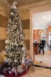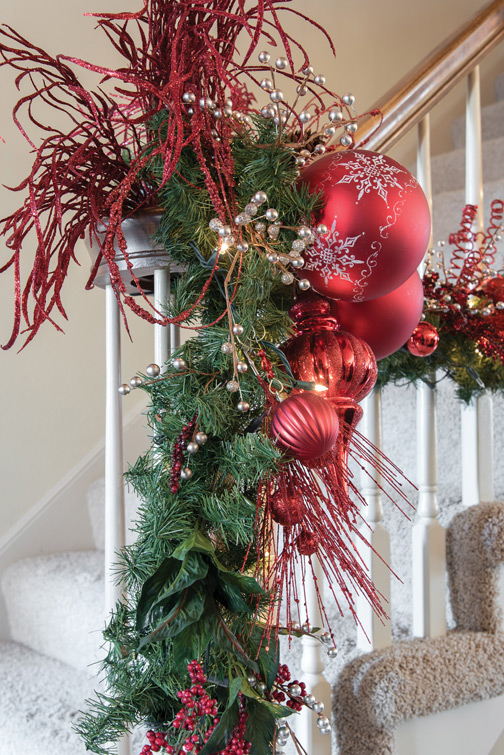 While seasonal color schemes may vary from client to client, the interior designer gravitates toward traditional Christmas hues in her own home — bold red, green and metallics on the main level, primarily silver in the foyer and a living room laden with gold. Likewise, the level of flashiness may vary by space.