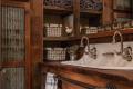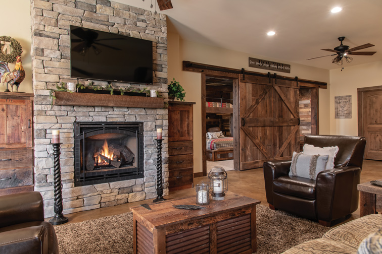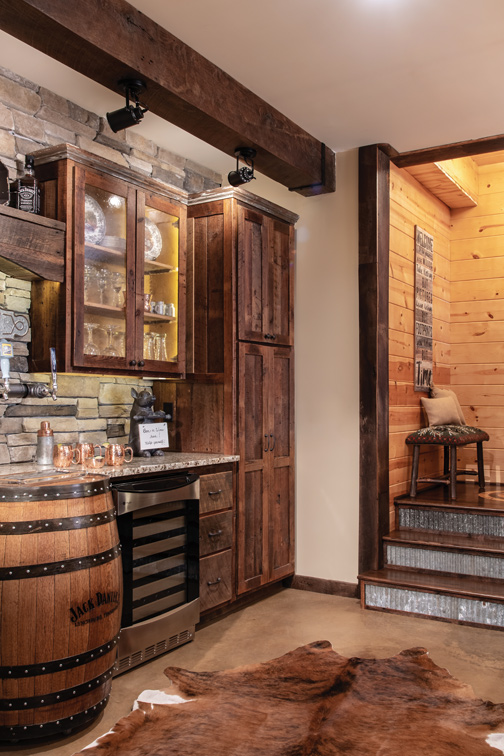 Space was a consideration in the bathroom, too, where a trough sink and built-in vanity accommodate multiple patrons, and a custom 9-foot upright storage closet stows plenty of extra linens. Stained concrete was a low-maintenance floor choice — one Kraft carried into two lower-level bars: a traditional wet bar and a wine bar centered on a kegerator Steve built into an old whiskey barrel. “All I have to do is show my husband a picture, and he makes it happen,” says Wendy, noting that Steve also built the wine barrel sink on the main level of their cabin.
