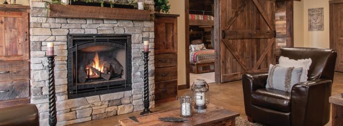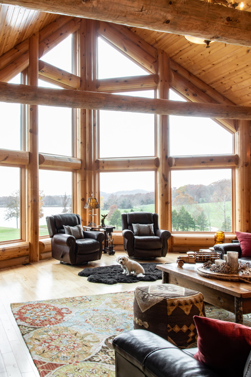 The Boveris envisioned a weekend home where Wendy, Steve and their four children could gather for years to come. While the idea of a hunting lodge was initially tossed around, the homeowners settled on a log cabin instead, from Wisconsin-based Golden Eagle Log & Timber Homes. The custom home came with solid log exterior walls and a floor-to-ceiling pine finish inside, with round timber beams, cathedral-style windows and a stunning stone fireplace.