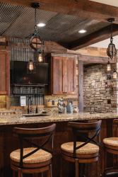 Comfortable seating at the wraparound wet bar was a must, but when there’s a big family gathering it’s usually around a site-specific dining table hand-built by Kraft. “Wendy wanted something guests could sit or stand around, and she wanted a unique base,” Kraft explains. The result is a show-stopping keepsake with a thick, woodsy top over a metal base, illuminated by a fixture Wendy found on Etsy. Wendy uses her family as a metric of success. Her high school and college age children visit the cabin frequently. “They say building this place was the best thing,” Wendy adds.