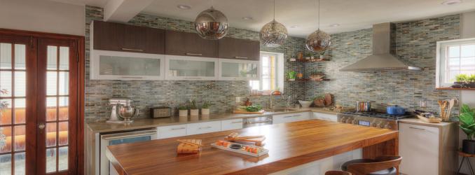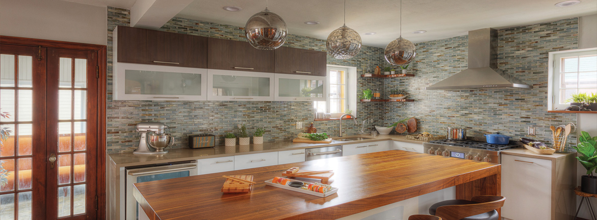 For the custom cabinets, created by making tweaks to standard Shiloh Cabinetry, the designer wanted to make sure they chose a finish that “didn’t fight the walnut.” The result is a horizontal stacking of glass-front white storage under a rich, chocolate natural wood with brushed silver hardware. The whole setup is delicately framed in soft blue tiling that spans the entirety of the wall, removing the typical backsplash break at eye level.