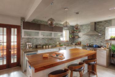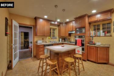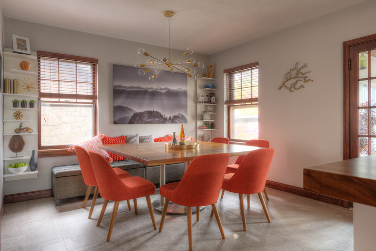 After removing the wall, Olsen McElvain unleashed the energy flow that had long been stifled, carrying the modern orange of the Joybird sofa into the gathering and game area via sumptuous and classically curvaceous dining room chairs. That warmth is echoed throughout the space in the warm wood tones of the custom walnut dining room table and island countertop. “Kirkwood Stair did a beautiful job on the custom woodwork,” Olsen McElvain swoons. “The island is dovetailed with this amazing waterfall edge.”
