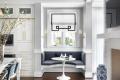 The banquette fits so perfectly into the space. The brass and gold oversized hardware are stunning details to the cabinetry. The tongue-and-grove ceiling is simply beautiful.