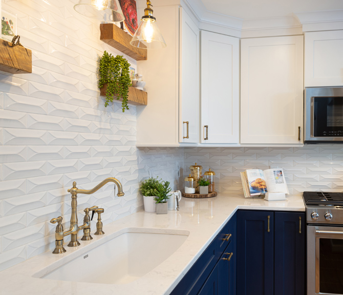 Candice and Tiffany worked together to pinpoint Tiffany’s style and bring it to life. Right off the bat, Tiffany knew that she wanted contrasting cabinets and KitchenAid appliances, requests that Candice was happy to oblige. First, the soffits were eliminated to make room for tall white upper cabinets that they paired with navy blue base cabinets from Archway Cabinetry. The textured Byzantine Bianco 3D Ceramic Subway Tile that covers the backsplash gives the room depth while not overpowering the bold cabinets.