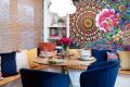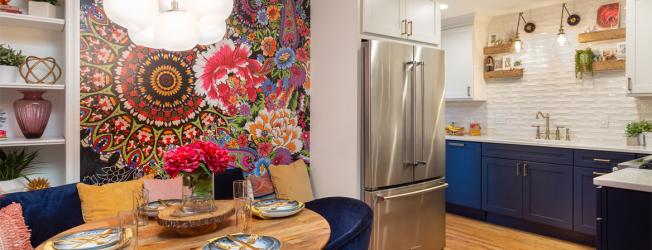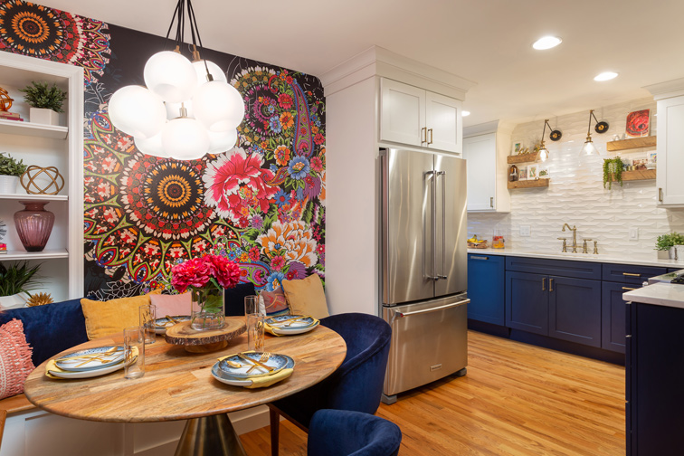 With the kitchen and dining room reconfigured to make hosting parties a breeze, the space needed a final touch. Candice knew Tiffany wouldn’t shy away from a vibrant statement wall, and they chose wallpaper panels from Brewster Home Fashions. Its colorful floral print gave the room the pop of color it needed while still tying in the navy blue found on the lower kitchen cabinets. “The wallpaper is vibrant and unusual,” Candice says. “It’s not something that you’d see in just anyone’s house; her bubbly personality and clear vision are what made this kitchen so unique.”