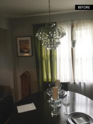 Tiffany wanted custom built-in bench seating in the dining area, but a short closet in the corner seemed to get in the way. Instead of removing the closet and losing much-needed storage space, Candice decided to turn the closet door into a bookshelf. “This new door allowed more space to showcase the client’s décor without having to forgo the storage the interior closet provides,” explains Candice. Now acting as extra storage and cute display, the bookshelf/closet overlooks built-in bench seating covered in the same wood and finish as the flooring. Hanging over the gold dining room table is a simple yet bubbly light fixture that played perfectly into Tiffany’s boho chic style, keeping the room trendy and in sync with the kitchen.