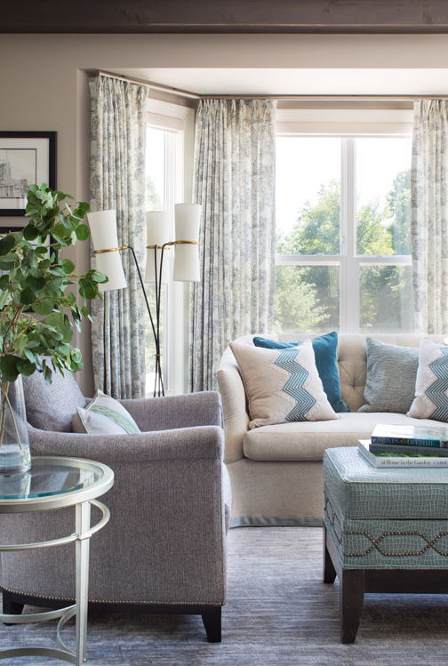 After the inspiration photos, Laura started building a color story for the home. While the Cecils gravitated towards neutrals they mixed in splashes of cool colors like blue, aqua, lavender and gray in fabrics and accessories. “I would select fabrics and textiles I thought would work in the home and would send Jen a box of swatches for each space in the home wrapped up with a pretty bow,” Laura explains of her process. “It allowed Jen to touch the materials and really visualize the space.” While different for the designer, it was a fun way to approach the design process and keep the homeowner involved.