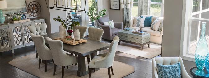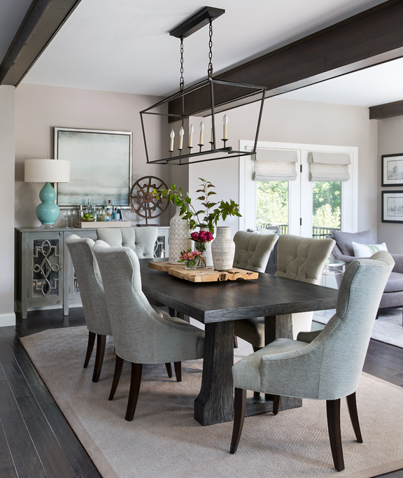 Since the main level of the home was open concept with no walls delineating spaces, each space had to complement the other. Dark-stained floors and griege-painted walls throughout helped create an even plane for decorating and accessorizing. The great room is central to the main level and the prime place the family hangs out. It is two stories in height, so the size and scale of the furnishings and lighting was important. Laura found a Ralph Lauren chandelier that is 5.5 feet wide and fills the ceiling space while casting beautiful light.