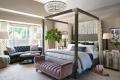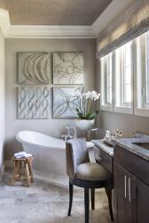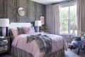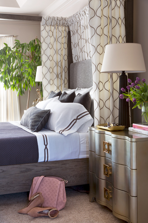 One space that they made all about the grownups was the master suite. The couple wanted it to be a place to escape, so the designer focused on making it very sophisticated and tactile with lots of layers of texture. They added a white, stacked-stone LED fireplace with crystals that let off a cool glow. Two Donghia covered silk pillows with threads of lavender, gray and blue defined the color story for the room. A lavender velvet bench is set at the end of the four-poster bed. Laura added the drapery around the bed to enhance the room's sophistication. Metallic silver-leafed nightstands and a crystal chandelier further amp up the grown up feel. A charcoal coverlet and light gray duvet fit into the color story but allow for the couple’s dogs to be on the bed. Laura also had a figure drawing by Denver artist Theresa Davis made for the space.