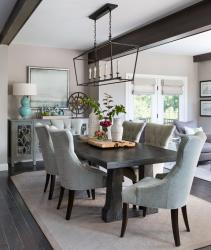 Displayed in the dining room on a rustic buffet piece with antique mirrored doors is an antique valve mounted on an iron base from an old building in St. Louis from Rick Ege Antiques, which adds an industrial touch. The 8-foot dining table is made of solid oak. The thick, heavy piece grounds the space and is surrounded by gray Crypton upholstered chairs. An oversized aqua glass lamp on the buffet adds color, and the palette was inspired by the soft, beachy tones in the artwork.