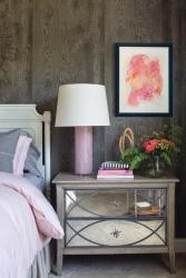Another space fit for a grownup that was very important to the couple was their nanny’s room. She loves the color pink, so Laura made sure to incorporate touches of the hue in the space, like in the pink glass lamps on the nightstands. Their nanny requested a rustic feel, and Laura found a faux wood wallpaper to accent behind the bed. Layers of texture in the space make it feel cozy, while the mirrored nightstand and chandelier make it sophisticated.