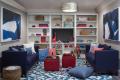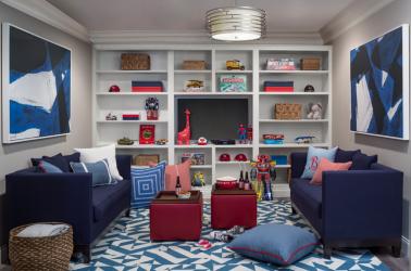 One final space was designed just for the kids. The playroom in the lower level is outfitted with custom-built bookshelves with places for the boys to display their Lego creations. Laura chose a red, white and blue Americana scheme and included tons of floor pillows to make the space cozy. Patterened FLOR tiles were used for their ease of care.