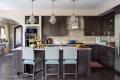 Open to the dining room, the kitchen carries the Aqua tones with three bar stools covered in an aqua leather seat with a textured fabric back and spaced out nailhead trim. The designer changed out the lighting opting for three pendants over the island. A Parisian waitress tray sourced from Rick Ege Antiques holds produce on the island. Laura likes the piece because it helps control the clutter in a big, open-concept space.