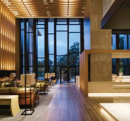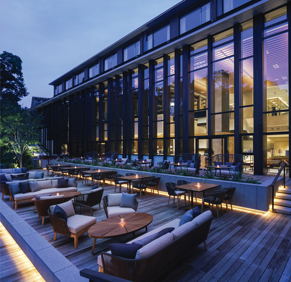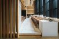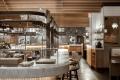 Kyoto, the ancient capital city of Japan, gained a beautiful new restaurant in 2016, the Brasserie. Located in Kyoto’s new and outstanding Four Seasons Resort, the Brasserie incorporates breakfast, lunch, afternoon tea, fine dining and lounge space all in one place. Interestingly, Kyoto is considered a traditional temple for Japanese food culture, but the Brasserie serves French cuisine; it’s actually located in the UNESCO, a protected area of Kyoto’s temples. The restaurant lies between the main lobby and the gardens, making it the first thing guests see when they arrive and the last thing they see when they leave the resort (other than the spectacular views of the traditional Japanese ikeniwa garden). Because the views were so striking, KoKaistudios decided to use an architectural strategy traditional in Kyoto that connects the indoors with the outdoors; this allowed a large architectural frame to unify three different areas of the restaurant: a lounge area, a central bar and a private dine dining area. The lounge area boasts a central fireplace and custom carpet, the latter patterned to represent a zen garden. One entrance to the restaurant is considered private, allowing patrons to take a stroll through a stone garden designed by Japanese artist Ramon Todo. The bar counter is made of pure carved stone and is used to serve breakfast, display food throughout the day and serve alcohol at night. Overall, the architecture of the restaurant is an extension of the surrounding Kyoto culture, even though it serves French food.