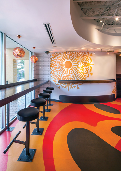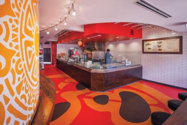 Mayana was the brainchild of the next generation of the Rodriguez family, who are well-known Mexican food experts in St. Louis. The Rodriguez family owns and operates the Hacienda, just as they’ve done for almost 50 years. But this next generation wanted to take Mexican food to the next level with a fast-casual version of their father’s successful restaurant while preserving the quality their customers had come to know and love. They leased a former Quizno’s in Clayton, a mere 1,400 square feet, and brought in the help of SPACE LLC to make their vision come to life. To save both time and money, SPACE LLC left the kitchen, line and bathrooms in the same place they’d always been. The small location required specialized kitchen equipment, like tortilla presses, and 17 seats for guests. Up to three guests can also eat at a standing, bar-height dining rail if they’re in need of a quick bite before they head off to work. It was important to the Rodriguez family that the design of their restaurant was different than other fast-casual Mexican restaurants, so Mayana uses a mix of traditional and modern Mexican design. Traditional chairs pair well with lantern lights and rustic wood accents, and the restaurant’s signature luchador face can be seen on the high-performance graphic floor at the entrance. Mayana is now a warm and modern Mexican restaurant with fast lines and high-quality food.