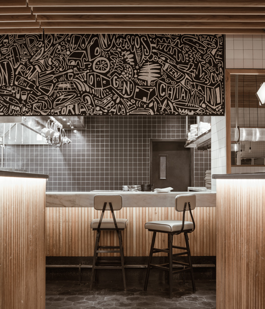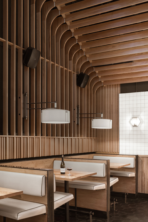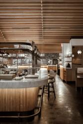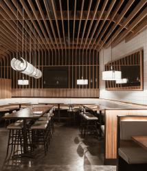 The design for Boqueria on West 40th in New York City is based on the famous Barcelona markets, called kioskos, that use a single great roof to cover the entire market. This upscale Spanish tapas restaurant wished to have a luxury feel while not overwhelming guests who wanted to relax, all while maintaining what they call a “buzzy” atmosphere. Studio Razavi Architecture sought to create an all-encompassing ambiance to mirror that of the market itself by using wood and concrete. Wood slats mitigate the changing ceiling heights before curving along the walls to give the whole room texture and a warm aura. The different rooms in Boqueria have varying atmospheres that provide each guest with their choice of grand or intimate. The centrally located bar and the open kitchen, both focal points in the space, surround visitors and act as important spatial elements for the rooms. Studio Razavi limited their building materials to wood, blackened steel, marble countertops and black cement floor tiles and varied the custom-designed light fixtures to outline the boundaries of each room. The end result for this open, yet delineated, concept was a comfortable and luxurious design that acted as a true slice of Barcelona.