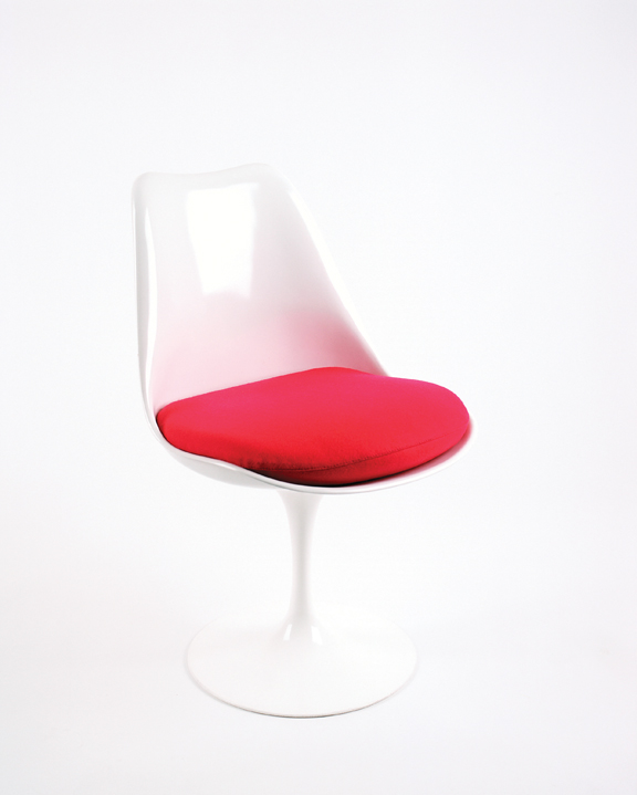 Like many designers after World War II, Eero Saarinen strove to cut excess and make sleek furniture with a focus. One of his focuses — or rather obsessions — was with the bottom of chairs. He felt that no designer had ever focused on a chair bottom before and that it showed. He commented, “The undercarriage of chairs and tables in a typical interior makes an ugly, confusing, unrestful world. I wanted to clear up the slum of legs. I wanted to make the chair all one thing again.” He succeeded in making a chair with an interesting seat and base; it was the Tulip Chair, manufactured by the Knoll company in New York City in 1957.