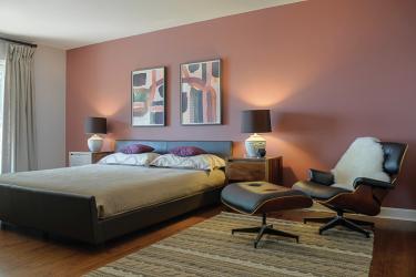 The infusion of color in the home reflects the function of each space. The master bedroom features slate gray walls to achieve a masculine and urban feel. While the muted tone fosters the intimate space of a private bedroom, Glover injects inviting tones into common areas such as the warm terra cotta color in the basement living space.