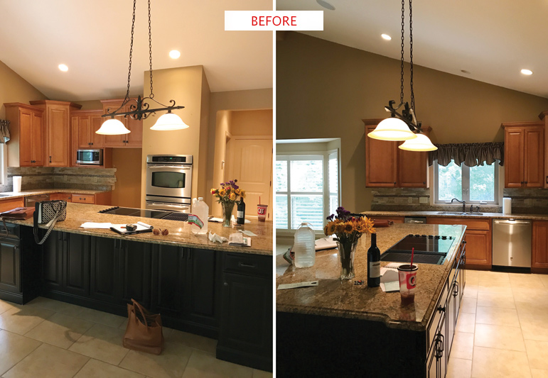 “We clicked right away,” says the homeowner. “She understood my design aesthetic and made everything so seamless.” The home’s exterior had a lodge feel, but the interior was Tuscan. The homeowner really wanted the kitchen to match the feel of the home’s exterior. She describes her vision as “Forest Chic,” meaning neutral colors that mix well with the greens and browns she sees from her window: simple, clean lines and elements of visual interest with a rustic touch.