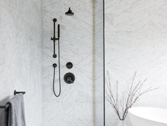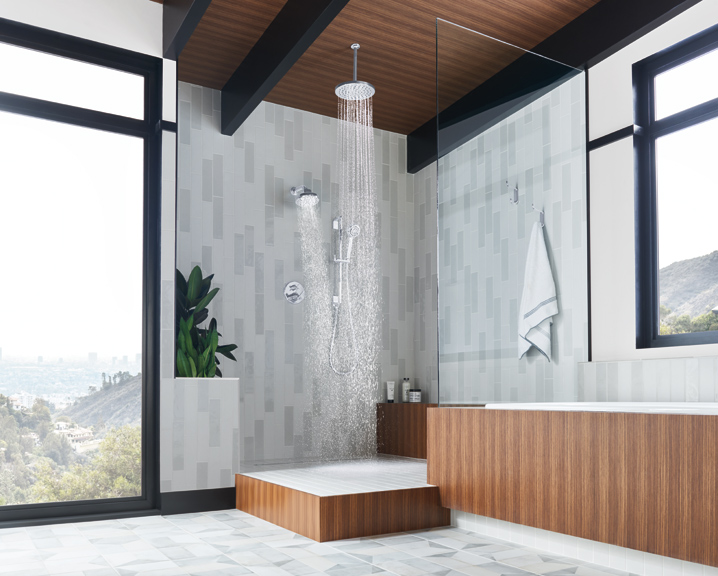 2. Annex shower rail system, by Moen, available at Crescent Plumbing Supply, Ferguson, Immerse, RSI Kitchen & Bath and Premier Plumbing Studio.