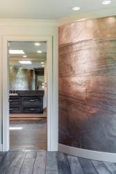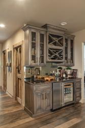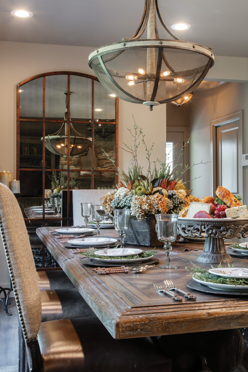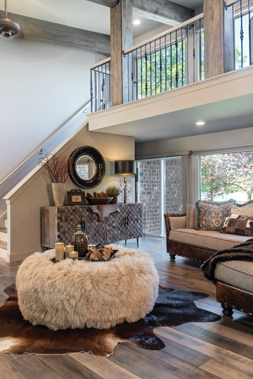 The designers’ crews then took over to create the natural “woodsy” décor requested by the owners. Barnwood was specified for the interior doors; the loft railings were replaced with wood and wrought iron; and the walls and ceilings throughout were painted a soft taupe hue.