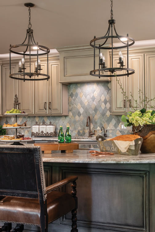 In the kitchen, the original cabinetry was quality-built and spacious, but definitely in need of work. The cabinets were artistically handpainted by Nettie White Interiors. Topped in ogee-edged quartz and lit by dimmable wrought-iron chandeliers, the large center island has a textured “leathery” finish, an induction cooktop with 12-inch exhaust fan and leather-and-tweed bar chairs tucked under the overhang.