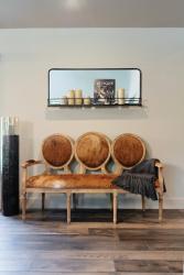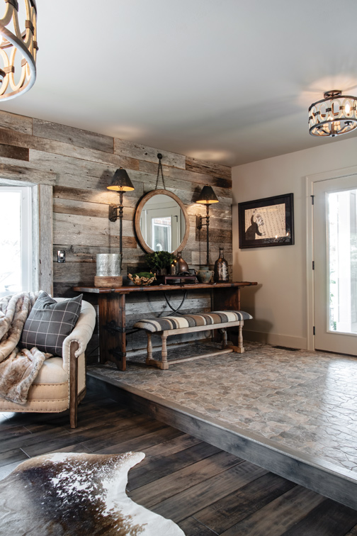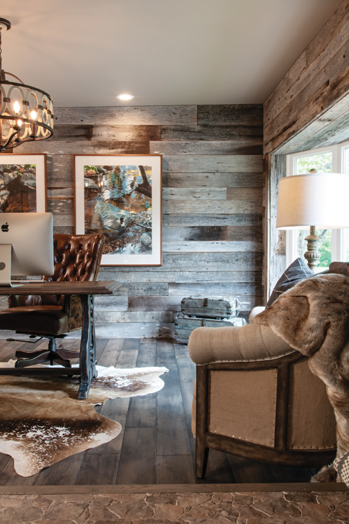Steven’s home office is decidedly masculine. Open to the step-up entry foyer, the walls are covered in Missouri barnwood planks. A tufted leather, Brazilian hair-on-hide chair accompanies the doctor’s open-concept desk, which is custom-fitted for his computer, and a reindeer throw adds character to a barnwood bench seat built into the window bay.